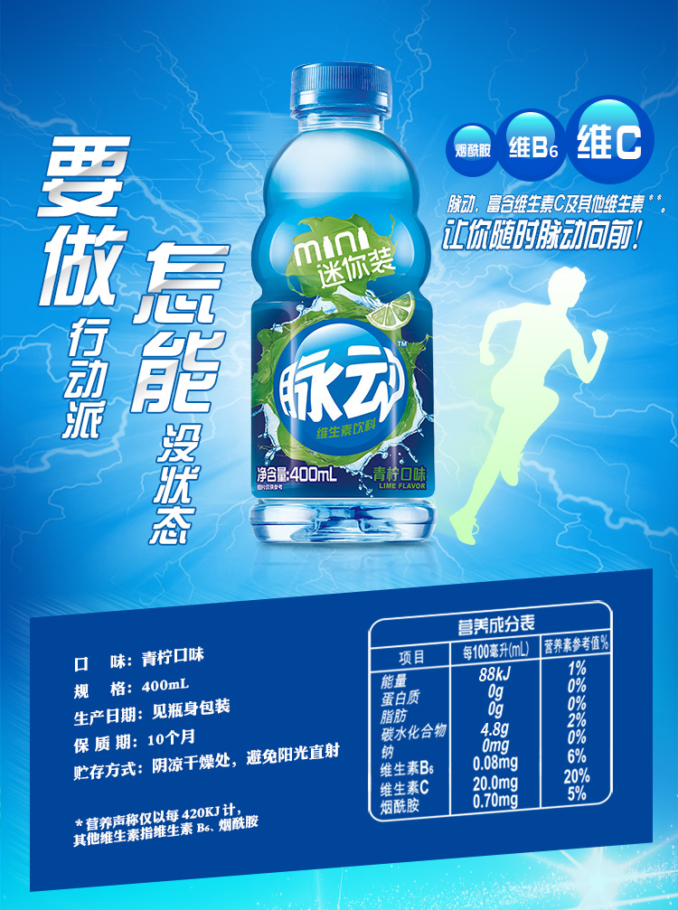 脉动(Mizone)青柠口味 维生素饮料 400ml*15瓶 整箱装