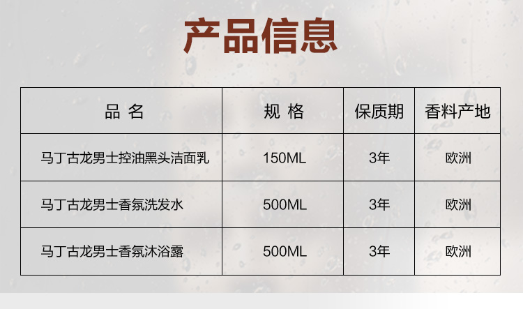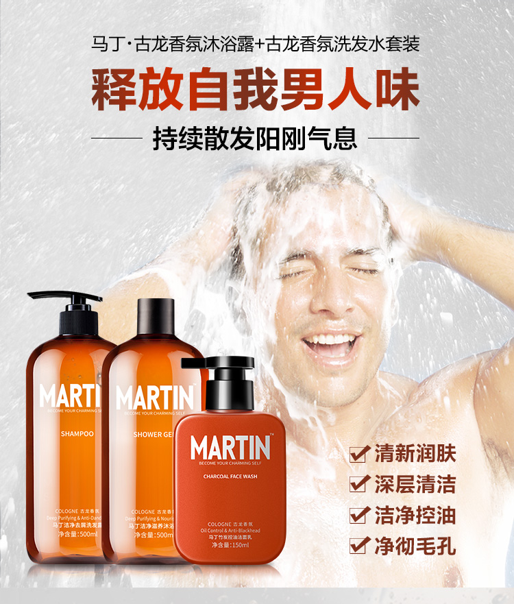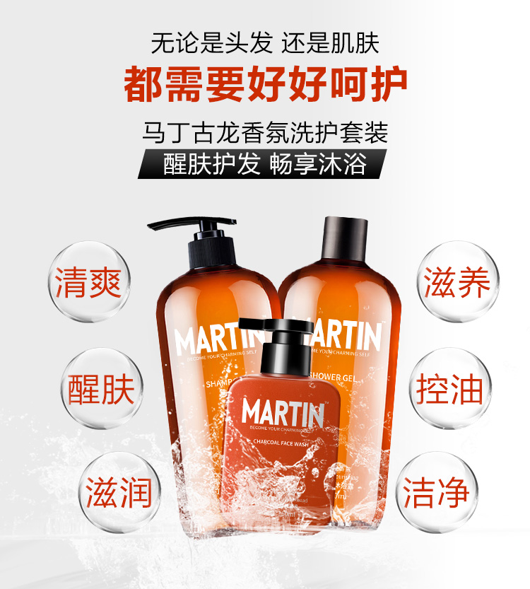 马丁 男士沐浴露古龙香氛洗发水洁面乳套装(身体护理三件套)
