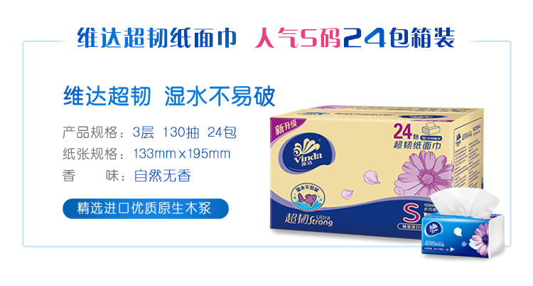 维达(Vinda) 抽纸 超韧3层130抽软抽*24包纸巾(小规格) 整箱销售