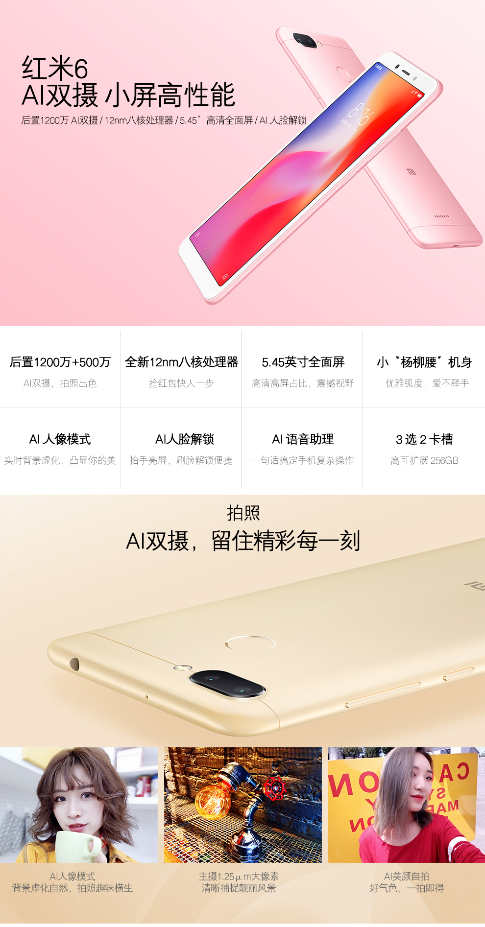 小米(MI) 红米6 学生手机 流沙金 4G+64G 全网通